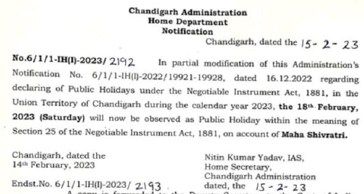 चंडीगढ़ (The News Air) चंडीगढ़ प्रशासन के होम डिपार्टमेंट ने एक नोटिफिकेशन जारी कर महा शिवरात्रि पर 18 फरवरी को पब्लिक हॉलिडे घोषित किया है। प्रशासन ने अपनी 16 दिसंबर, 2022 की नोटिफिकेशन में आंशिक बदलाव करते हुए शिवरात्रि पर सरकारी छुट्‌टी की घोषणा की है। इस दौरान चंडीगढ़ में सभी सरकारी दफ्तरों में अवकाश रहेगा।