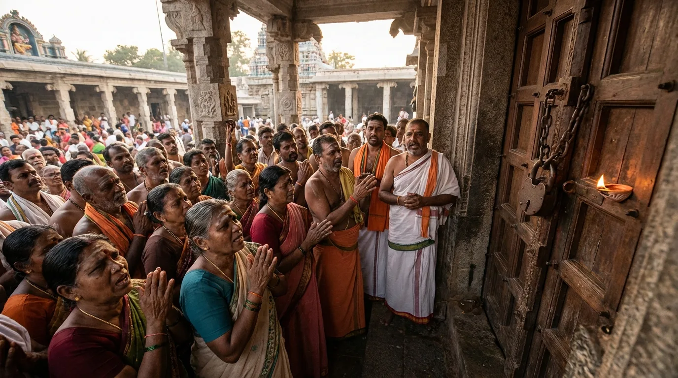 इस बीच सबसे बड़ा हंगामा तब हुआ जब श्रद्धालुओं ने देखा कि गर्भगृह के मुख्य द्वार पर ताला लटक रहा है। देश-दुनिया से आए भक्त इस दृश्य को देखकर भड़क उठे। उन्होंने प्रशासन की इस कार्रवाई की तुलना कंस के शासन से करते हुए जमकर नारेबाजी की। श्रद्धालुओं का कहना था कि भगवान को इस तरह जंजीरों और तालों में कैद करना उनकी आस्था पर गहरी चोट है। “भगवान के द्वार पर ताला लगना उनकी भावनाओं को ठेस पहुंचाने जैसा है,” एक श्रद्धालु ने आंसू भरी आवाज में कहा।