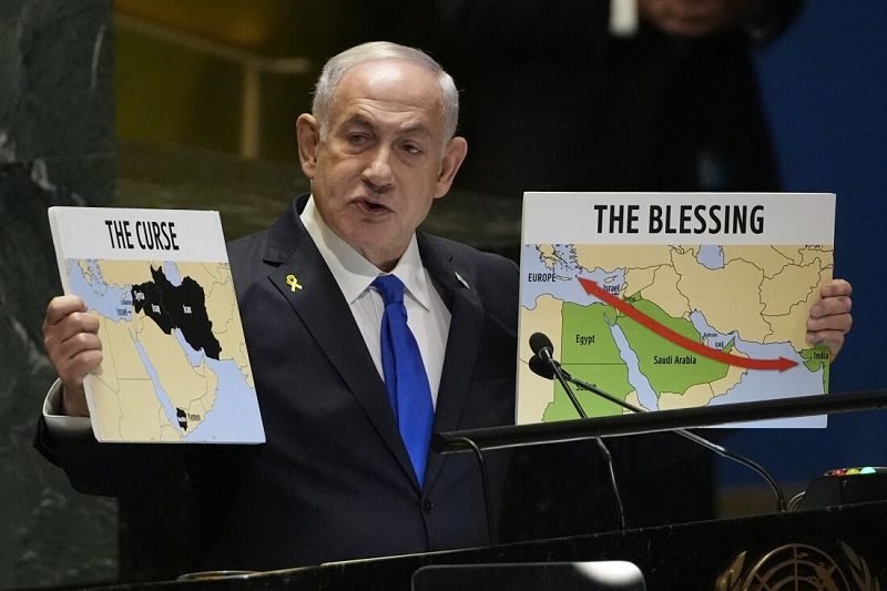 इसके बजाए, नेतन्याहू ने इस मौके पर आशीर्वाद और अभिशाप का जिक्र किया। आशीर्वाद के तौर पर उन्होंने यहूदियों और अरबों, यहूदी धर्म और इस्लाम, मक्का और यरूशलेम के बीच ऐतिहासिक सुलह को परिभाषित किया। खासतौर पर उन्होंने इजरायल और सऊदी अरब के बीच सामान्यीकरण की संभावनाओं पर बात की। इसके अलावा एक नक्शे के जरिए भारत-मध्यपूर्व-यूरोप कॉरिडोर का भी जिक्र किया। वहीं, एक अन्य नक्शा दिखाया, जिसमें अभिशाप के रूप में ईरान के नेतृत्व वाले आतंक को दिखाया। इसमें उन्होंने इराक और सीरिया में शिया मिलिशिया, लेबनान में हिजबुल्लाह, गाजा में हमास और यमन में हूतियों को शामिल किया।