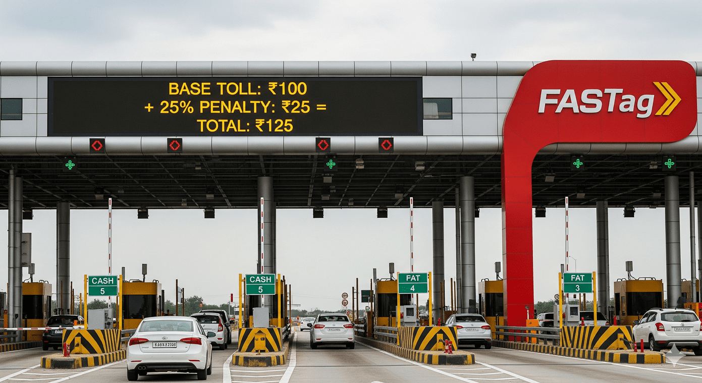 15 नवंबर, 2025 से बिना FASTag वाली गाड़ियों को अब सिर्फ 25% अतिरिक्त शुल्क देना होगा।
