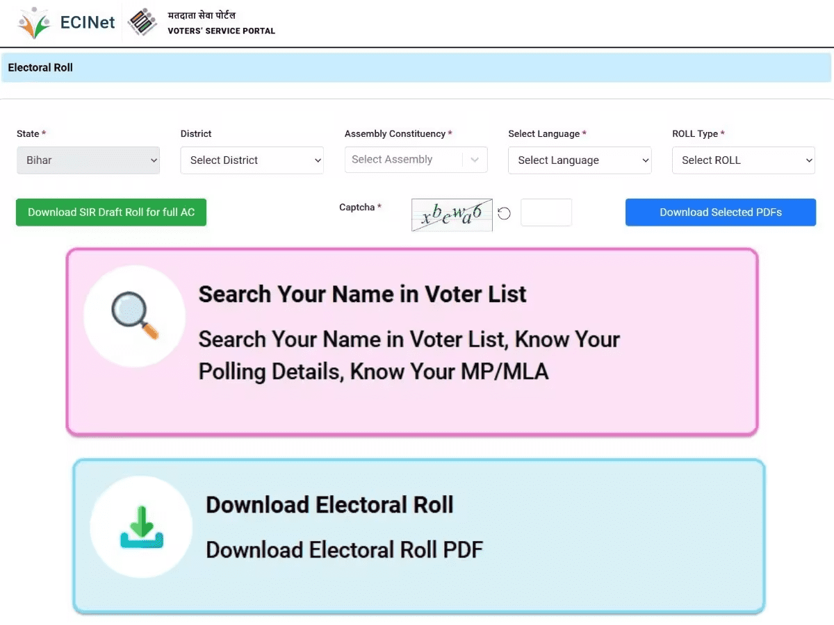 ऑनलाइन eci.gov.in और वोटर सेवा पोर्टल पर उपलब्ध।