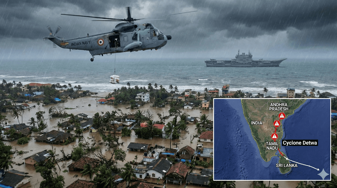 Cyclone Detwa News श्रीलंका में आए विनाशकारी तूफान ‘डिटवा’ ने भारी तबाही मचाई है। हालात इतने बेकाबू हो चुके हैं कि अब भारत को अपने विमानवाहक पोत आईएनएस विक्रांत (INS Vikrant) के विमानों को राहत कार्यों के लिए तैनात करना पड़ रहा है। 28 नवंबर को आए इस शक्तिशाली तूफान ने श्रीलंका के कई इलाकों को जलमग्न कर दिया है और अब इसका रुख भारत के तटीय इलाकों की ओर है, जिससे यहां भी खतरे की घंटी बज गई है।