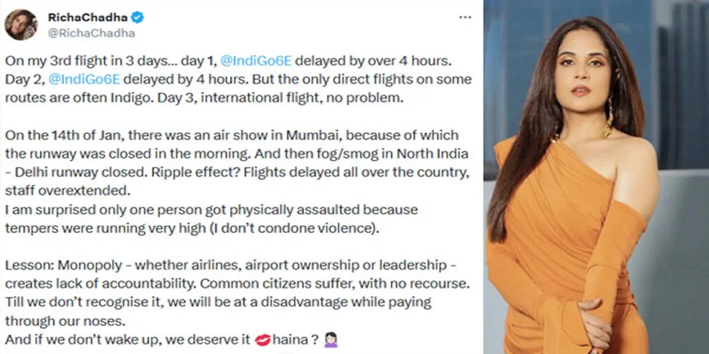 नई दिल्ली, 17 जनवरी (The News Air) बॉलीवुड एक्ट्रेस ऋचा चड्ढा ने बुधवार को कहा कि उन्हें भी इंडिगो एयरलाइंस की दो घरेलू उड़ानों में देरी का सामना करना पड़ा।