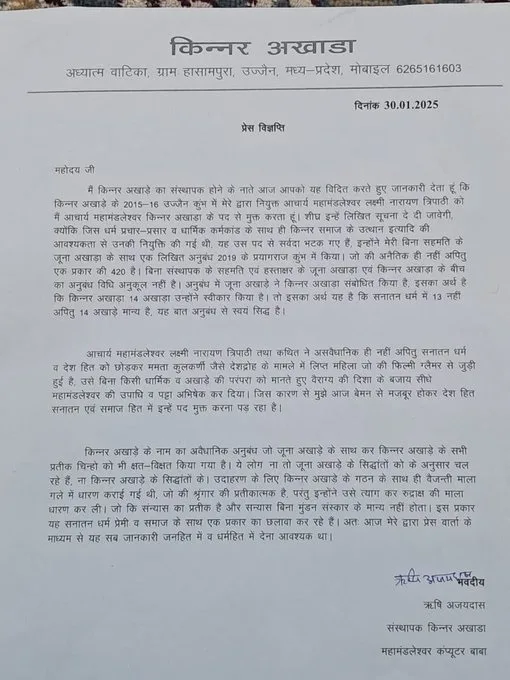 • “ममता कुलकर्णी संत परंपरा का पालन नहीं कर रही थीं, इसलिए उन्हें भी हटाया गया।”