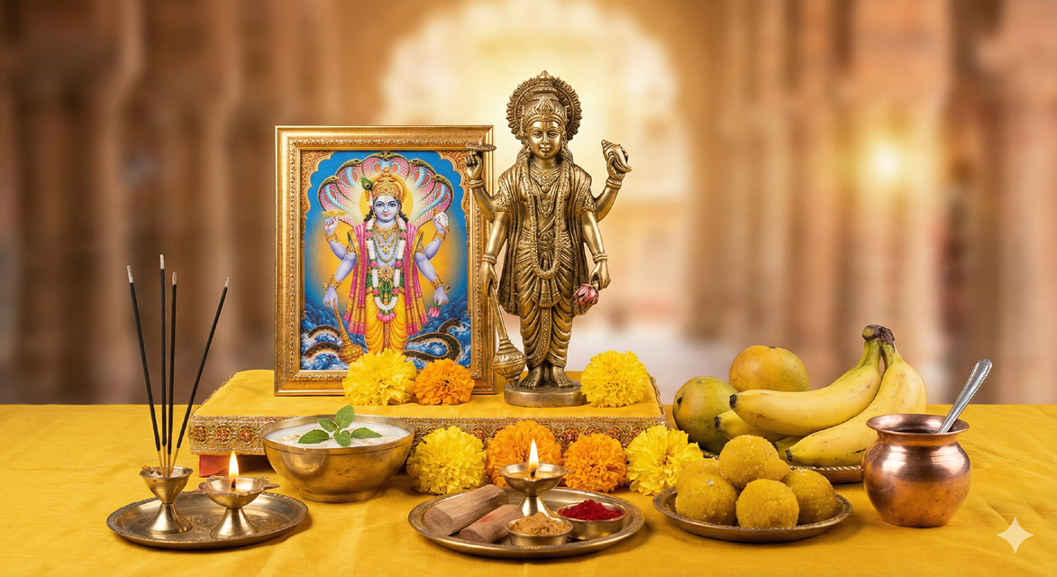 इसके अलावा श्री हरि की प्रतिमा या तस्वीर, तुलसी दल (जो पूजा का सबसे अहम हिस्सा है), धूप, दीप, चंदन, अक्षत, रोली और गंगाजल रखें। भगवान को भोग लगाने के लिए घी, मिठाई, और विशेष रूप से ‘पंचामृत’ तैयार करें। पंचामृत में दूध, दही, घी, शहद और गंगाजल के साथ तुलसी दल मिलाना न भूलें। प्रसाद के रूप में पीली मिठाई, बेसन के लड्डू, केला, आम या अन्य मौसमी फल अर्पित किए जा सकते हैं।