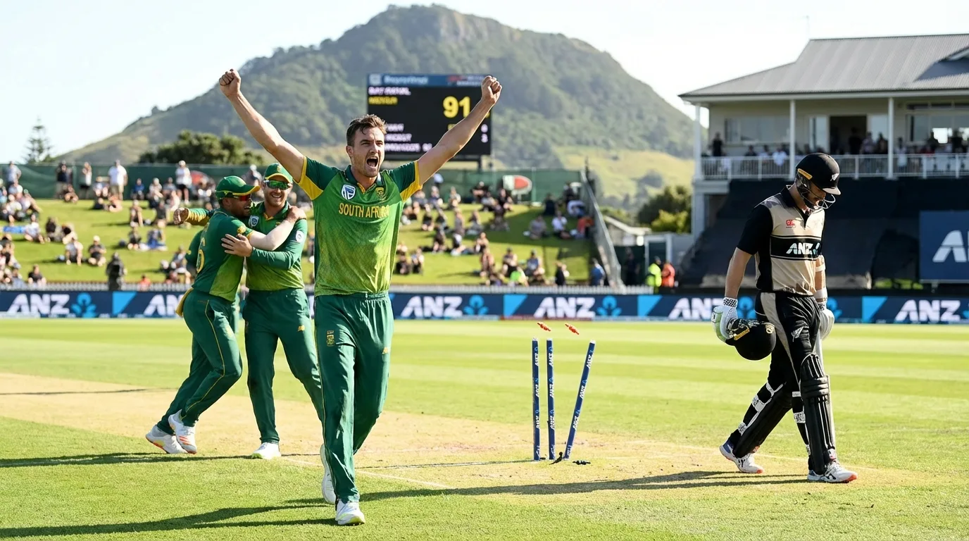 NZ vs SA T20 Series 2026 का पहला मैच साउथ अफ्रीका ने माउंट मॉन्गनुई के बे ओवल में एकतरफा अंदाज में अपने नाम कर लिया। 15 मार्च को खेले गए इस मैच में न्यूजीलैंड की पूरी टीम महज 14.3 ओवर में 91 रन पर सिमट गई। जवाब में साउथ अफ्रीका ने 92 रन का मामूली लक्ष्य 16.4 ओवर में 7 विकेट शेष रहते हासिल कर लिया। मेहमान टीम ने इस जीत के साथ T20 वर्ल्ड कप 2026 के सेमीफाइनल में कोलकाता में मिली 9 विकेट की शर्मनाक हार का महज 11 दिनों में बदला ले लिया। NZ vs SA Live Score पर नजर रख रहे क्रिकेट फैंस के लिए यह एक शानदार मुकाबला रहा।