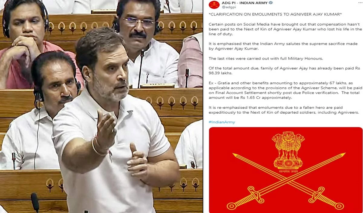 हम आपको बता दें कि राहुल गांधी के आरोपों के बाद भारतीय सेना ने सोशल मीडिया पोस्ट में किए गए उन दावों को खारिज कर दिया है कि ड्यूटी के दौरान जान गंवाने वाले अग्निवीर अजय कुमार के परिजनों को मुआवजे का भुगतान नहीं किया गया। सेना ने कहा कि परिवार को देय राशि में से 98.39 लाख रुपये का भुगतान पहले ही किया जा चुका है। सेना ने अपने स्पष्टीकरण में कहा है कि कुल राशि लगभग 1.65 करोड़ रुपये होगी। हम आपको बता दें कि सेना का यह स्पष्टीकरण लोकसभा में विपक्ष के नेता राहुल गांधी द्वारा ‘एक्स’ पर अजय के पिता का एक वीडियो साझा करने के बाद आया, जिसमें उन्होंने कथित तौर पर कहा था कि उन्हें कोई पैसा नहीं मिला है। राहुल गांधी ने आरोप लगाया था कि रक्षा मंत्री राजनाथ सिंह ने ‘अग्निवीर’ की मृत्यु की स्थिति में उनके परिवार को आर्थिक सहायता मिलने के बारे में संसद के भीतर झूठ बोला।